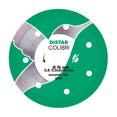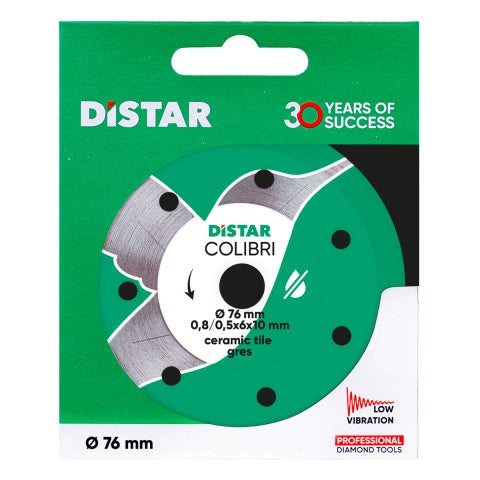 De Distar Colibri 76 mm is een compacte diamantschijf voor delicate sneden waar een standaard 115/125 mm schijf te onhandig is. Ze wordt gebruikt op (accu)haakse slijpers voor kleine uitsparingen, korte invalsneden en detailwerk in keramiek en porcellanato. Door de kleine diameter is de schijf wendbaar en blijft de zaagsnede smal, wat helpt bij nauwkeurig passen en afwerken. De 76 mm uitvoering is geschikt voor gebruik op mini haakse slijpers zoals de Flex LBE 76 12-EC, met asgat volgens variant.