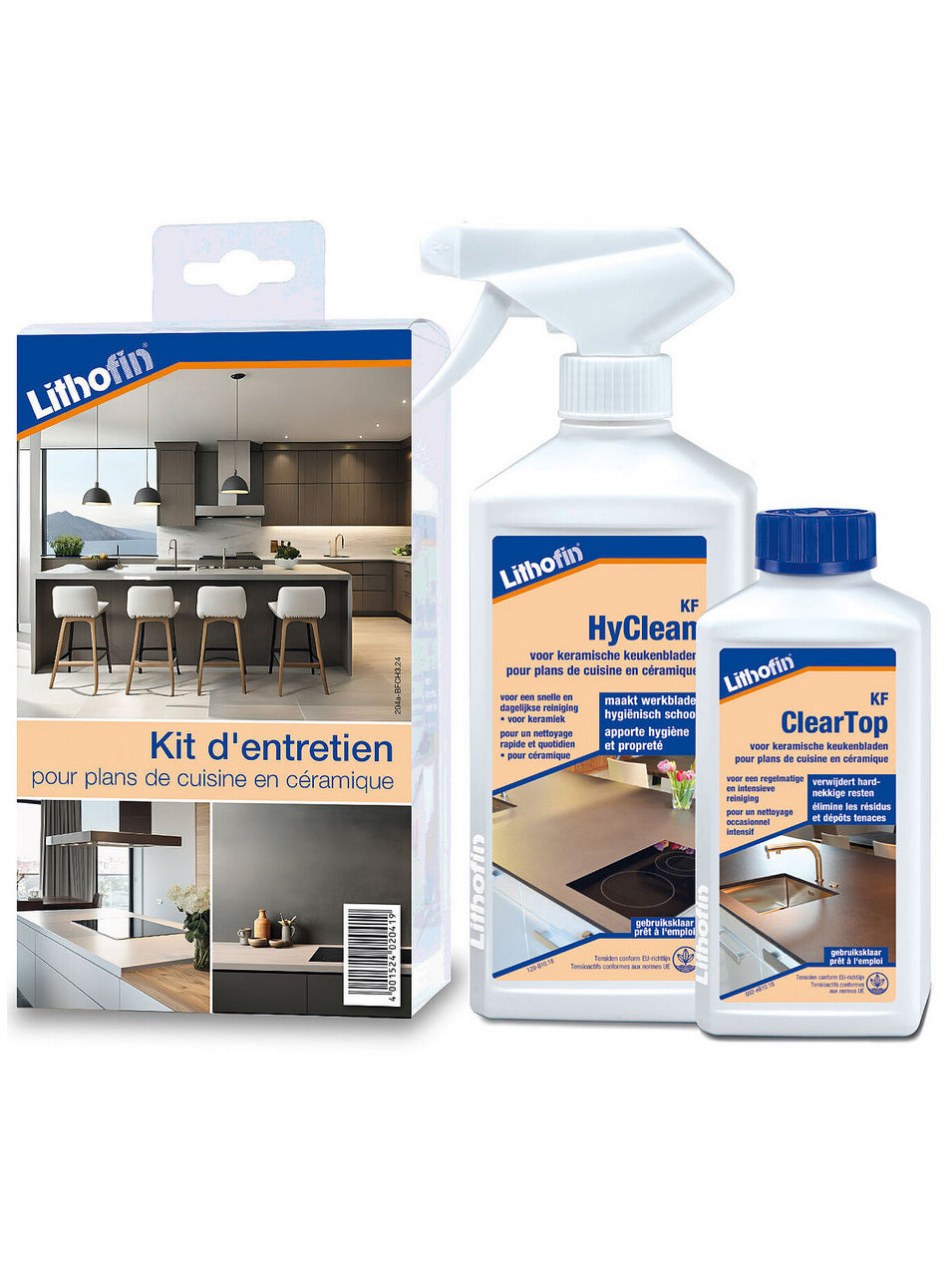 Onderhoudsset in een compact set: Voor alle keramische keukenbladen. Lithofin KF HyClean voor de dagelijkse reiniging van keukenwerkbladen. Verwijder zware vervuiling met Lithofin KF ClearTop.
