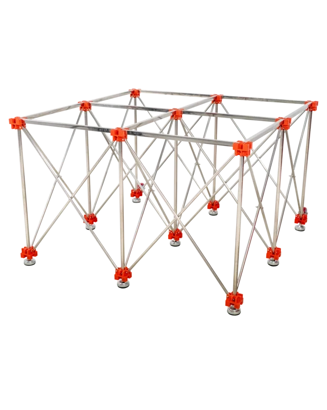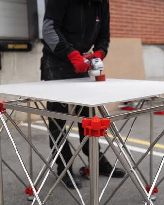 Inklapbare werktafel; biedt ondersteuning en stabiliteit tijdens snijden en monteren. Verkrijgbaar in 120x120 cm (tot 700kg) of voor grootformaat tegels 300x120 cm (tot 1500kg).